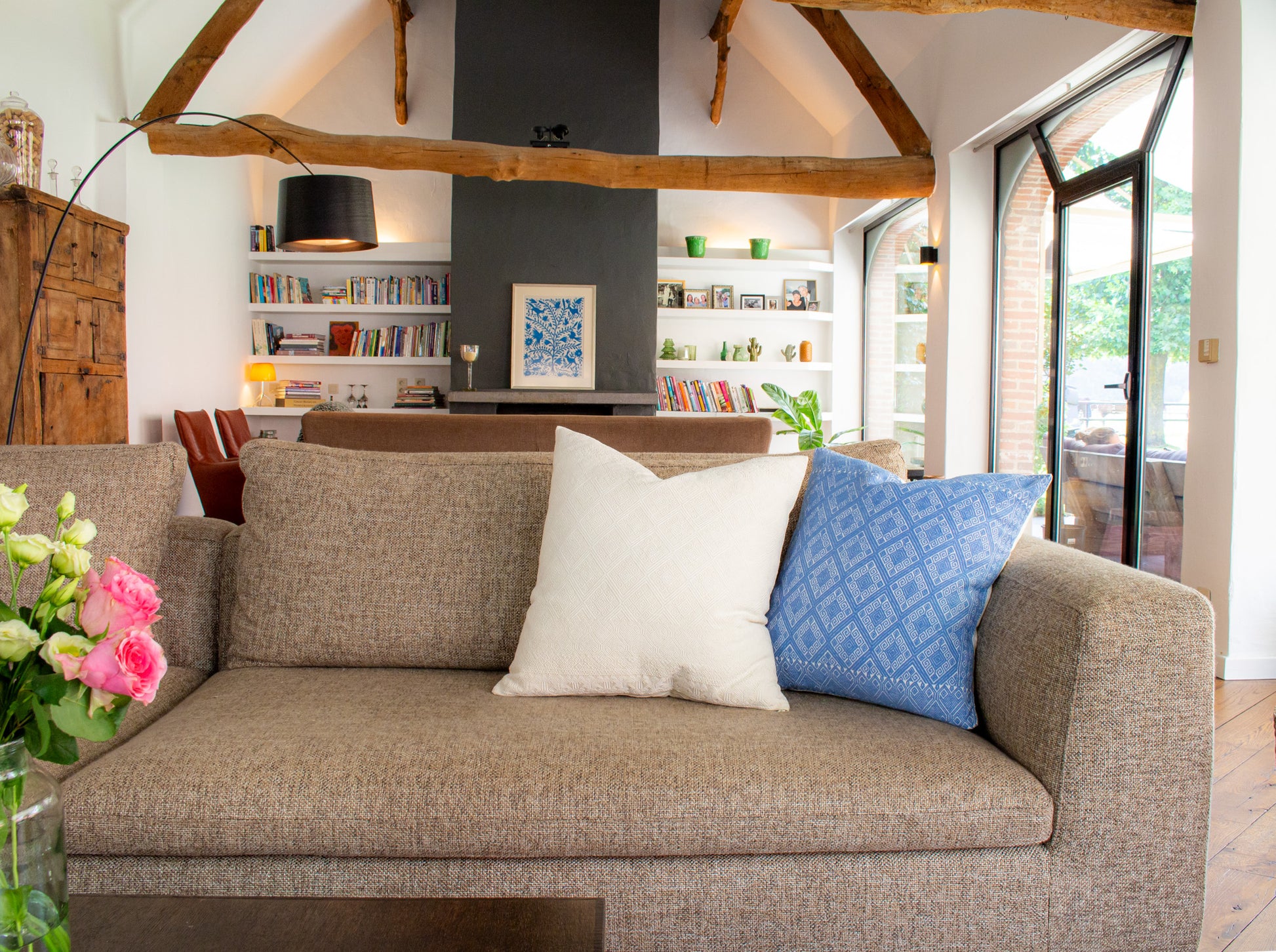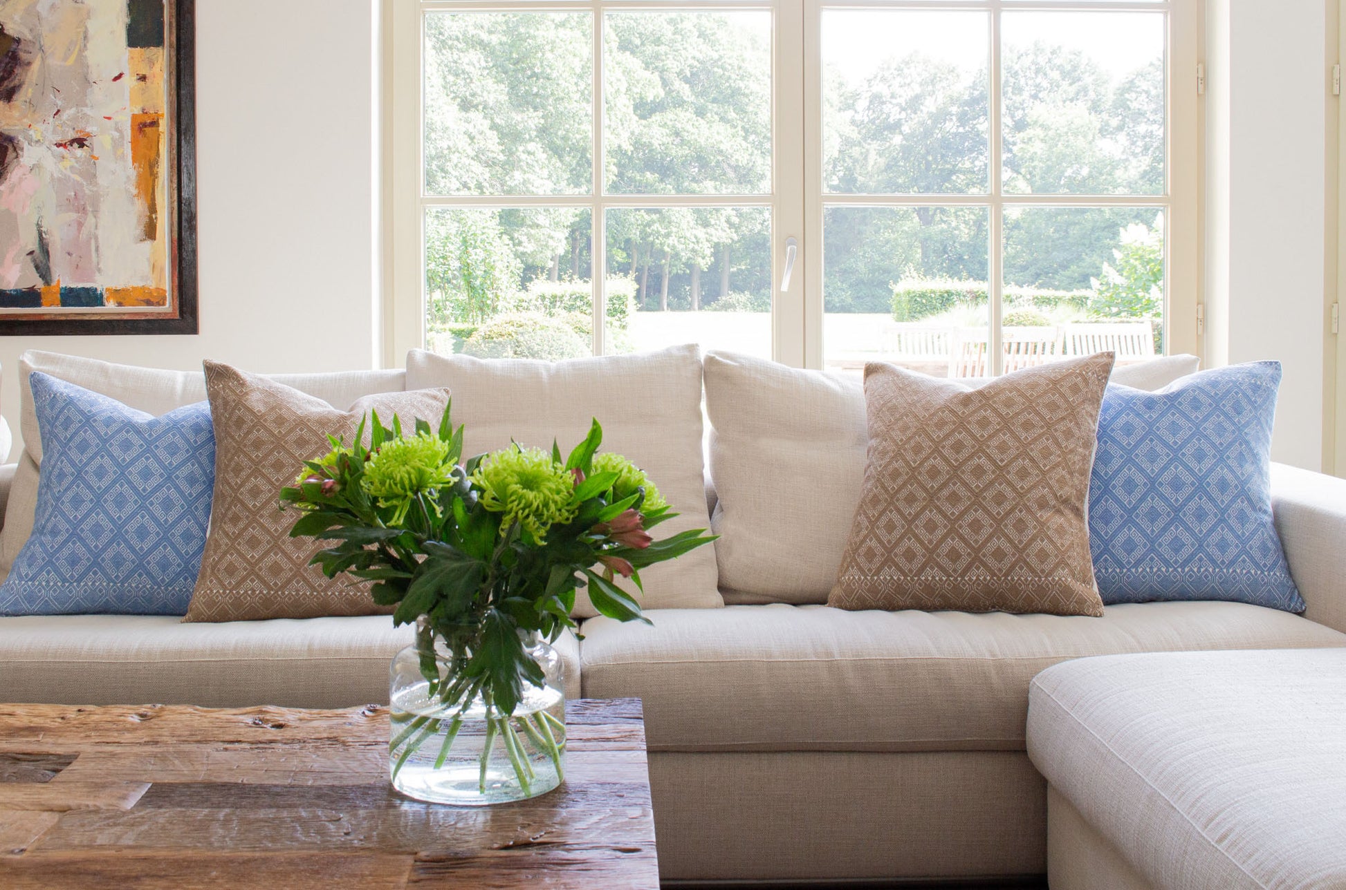 Binnenkussens gemaakt met 100% katoenen twill hoezen, gevuld met Nederlandse eendenveren voor zowel volume als duurzaamheid.