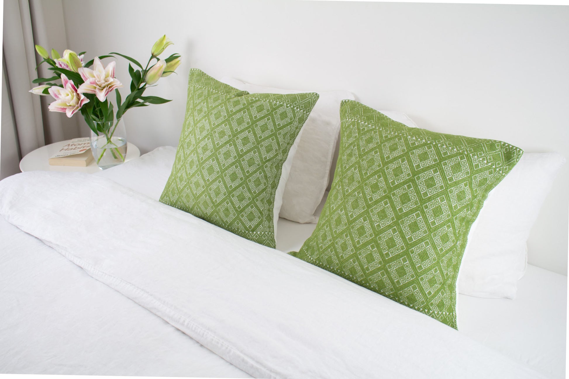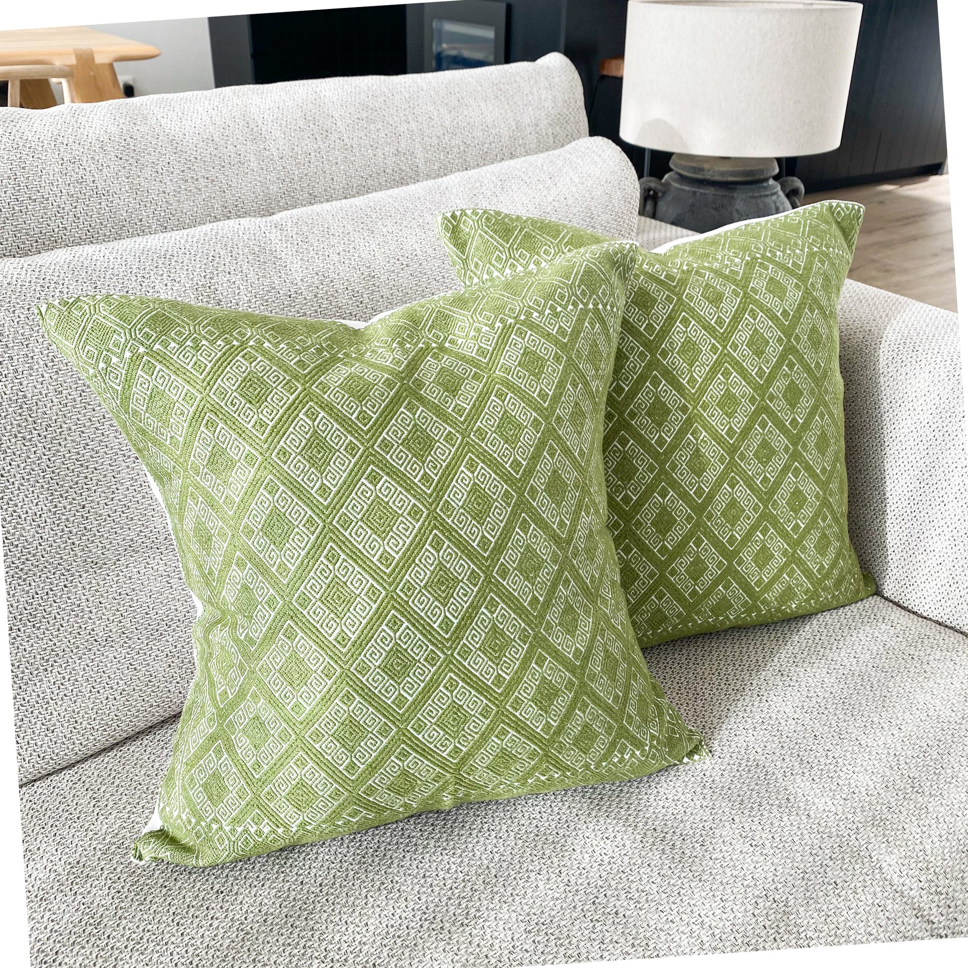 Verwijder schone vlekken voorzichtig met een vochtige doek. Handwas met mild wasmiddel in lauw water. Plat aan de lucht laten drogen, uit de buurt van zonlicht. Laag strijken en een doek over de kussenhoes leggen om direct contact te voorkomen. Vermijd machinaal wassen, bleken of drogen in de droger.